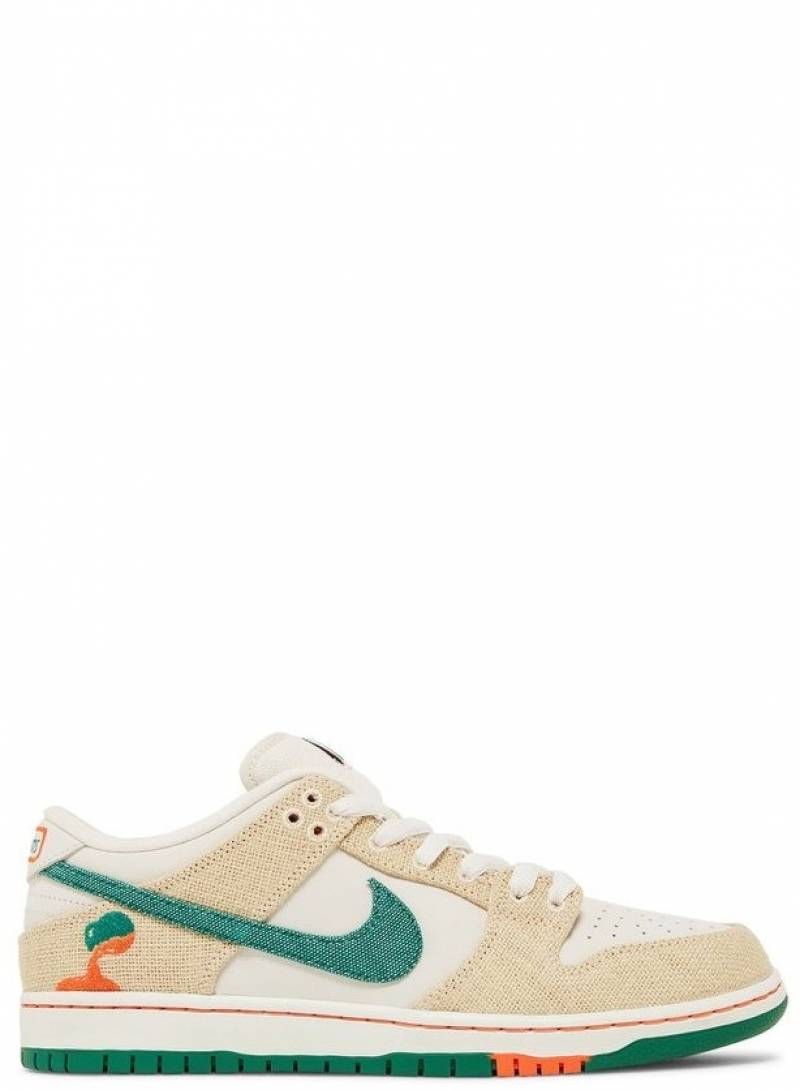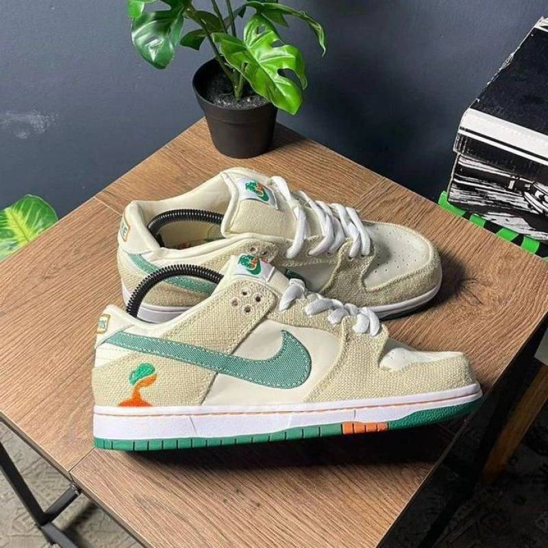 The Jarritos x Nike Dunk Low SB showcases a collaborative design inspired by the popular Mexican soda brand. The upper combines a Phantom white leather base with hemp canvas overlays and a Malachite green textile Swoosh. The Jarritos logo is embroidered in green and orange on the lateral heel, while dual branding embellishes the woven tongue tag. Mismatched heel tabs are emblazoned with 'Nike' and 'Jarritos' across the left and right shoe. Anchoring the sneaker is a durable rubber cupsole that pairs white sidewalls with a two-tone green and orange outsole.